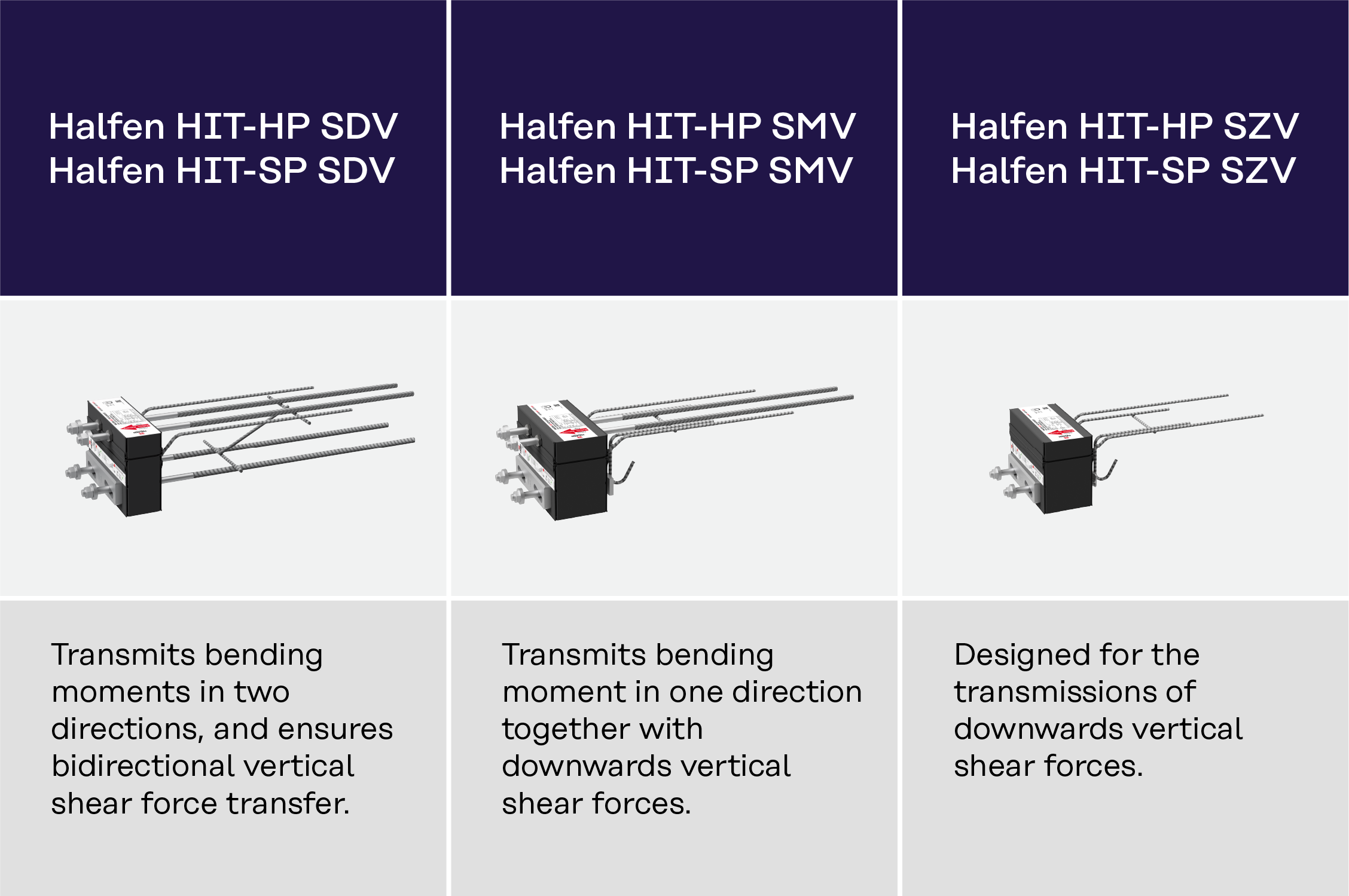 The Halfen HIT Steel-to-Concrete range is available in three variants, each tested and approved for defined load transfer functions: