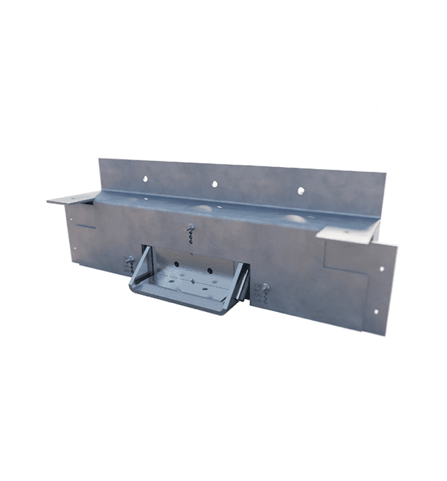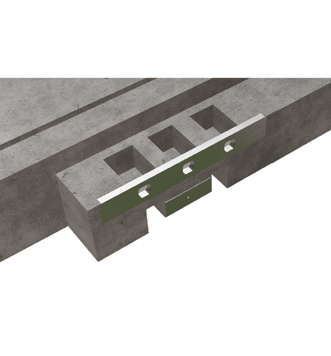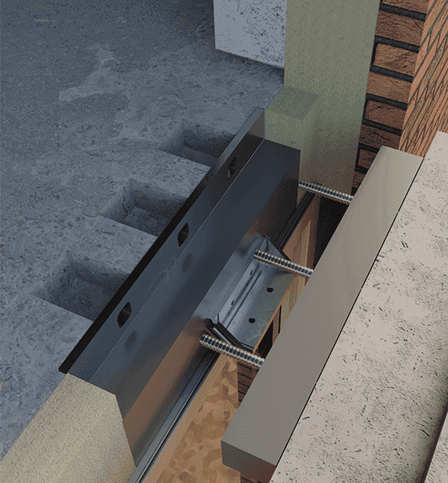 Creates the necessary space at the BOTTOM below soffit of the balcony, ALLOWING to allow the insertion of the load bearing bracket located IN THE FLOOR SLAB SIDE at the side of the floor slab. This recess allows for a 20 mm longitudinal adjustment (+10 mm / −10 mm) across the width of the balcony.