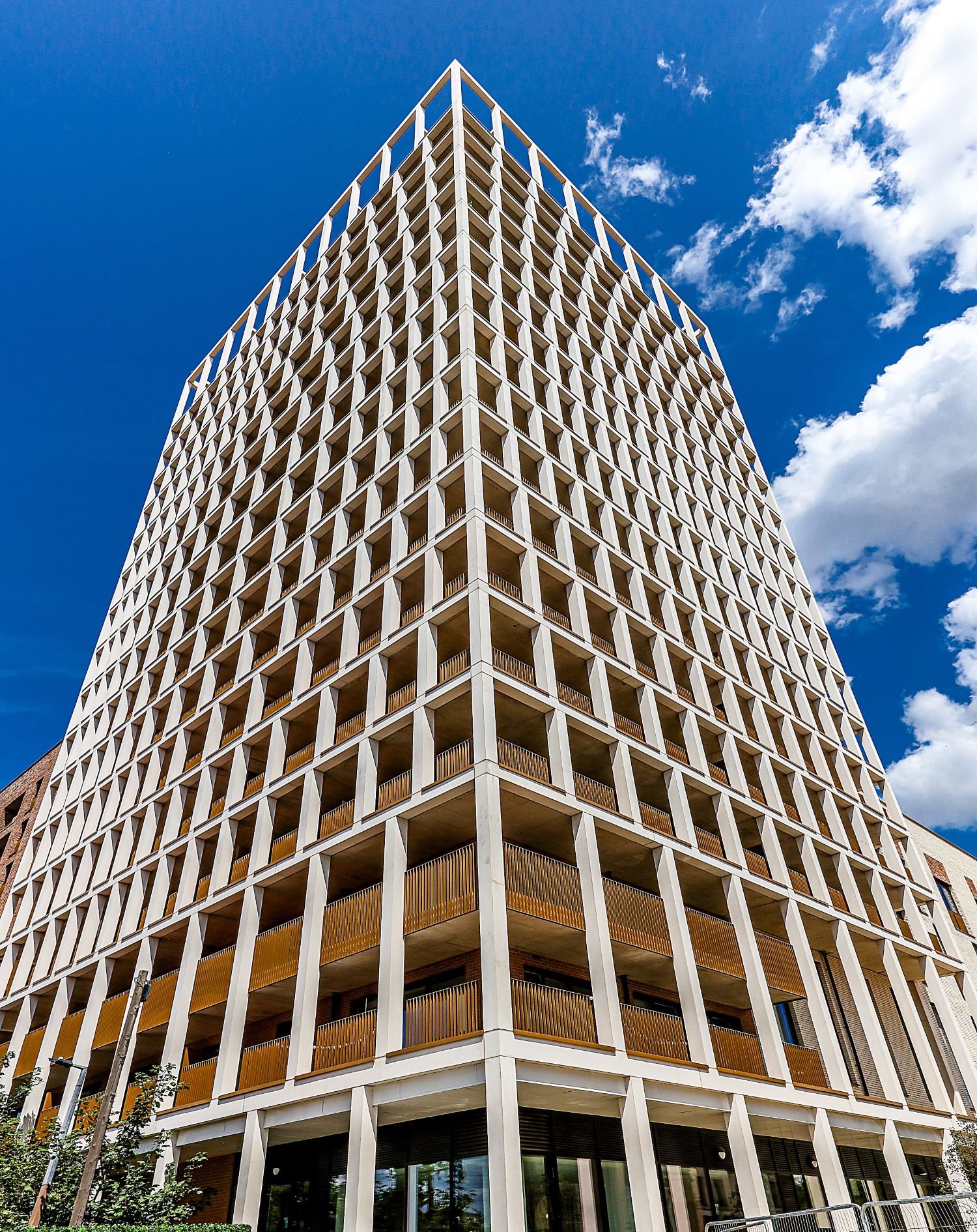 Spearheading the regeneration of this area of East London, the development is laid out over a number of blocks of differing design and height, typically featuring contemporary red London Brick façades to complement the area’s historic architecture, anchored by a stunning 17-storey white concrete tower with visually impactful structural grid façade, created using an unusual precast concrete exoskeleton.