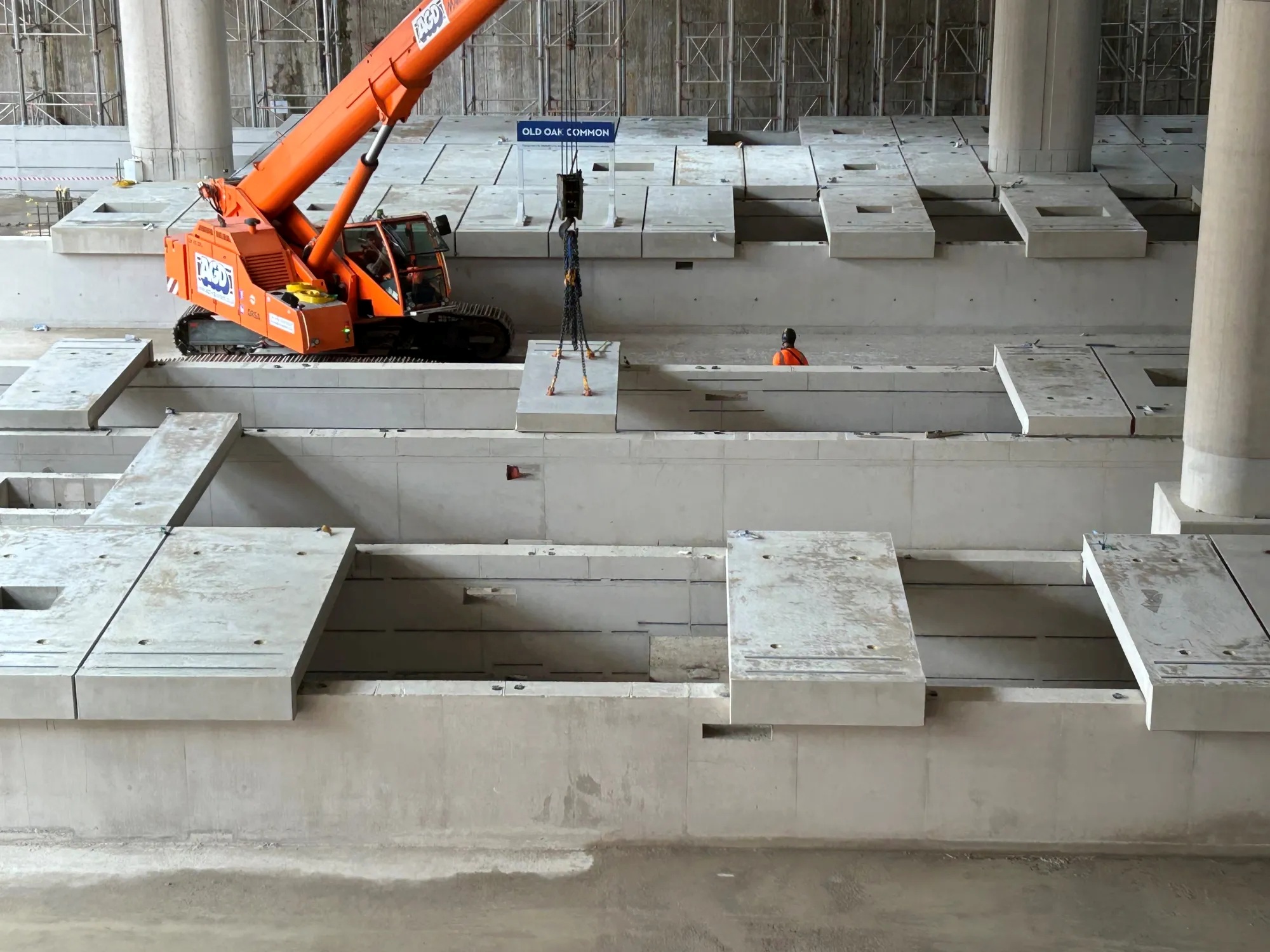 The HS2 platforms are formed from 4m long by 2m wide precast concrete slabs, elevated from the 45,000m2 concrete base slab on 1.59m high cast insitu concrete supporting walls.