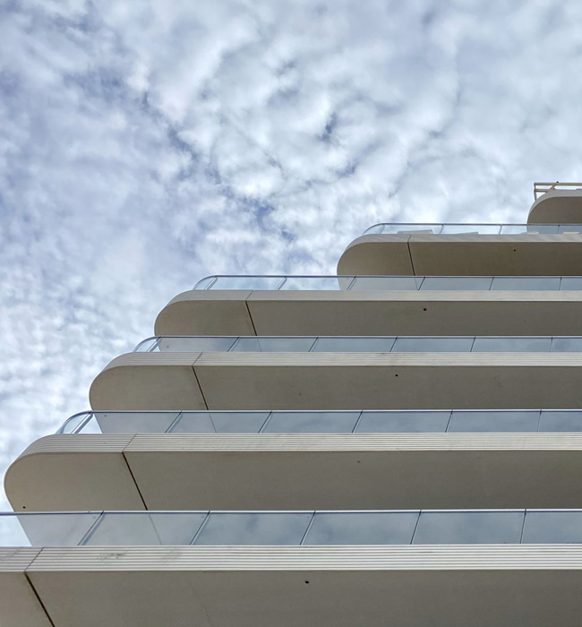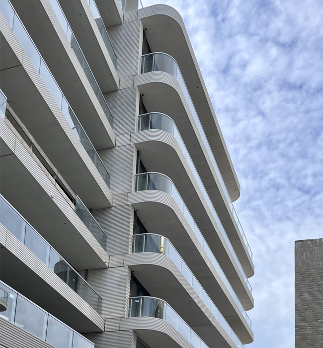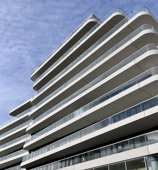 Aan de gevel van dit gebouw bevindt zich maar liefst 2500 m2 balkon. ZZDP Architecten heeft Balqoon gevraagd voor het vinden van een oplossing voor de balkonverankering in project Nieuw Kijkduin Blok 1 Lombarde. Balqoon heeft hierbij gekozen voor een combinatie van haar eigen holle balkonsysteem in combinatie met het Halfen koudebrugonderbrekingssysteem van Leviat. Romy Jacobs-Tetteroo (Officemanager Balqoon): “Dit hebben we in zeer fijne samenwerking met Leviat gerealiseerd”.